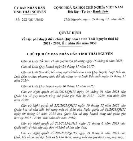Với nhiều nội dung quan trọng, mang tính chiến lược dài hạn nhằm cụ thể hóa định hướng phát triển trong giai đoạn mới, tạo nền tảng để Thái Nguyên bứt phá, trở thành trung tâm công nghiệp hiện đại và phát triển bền vững của vùng Trung du và miền núi phía Bắc. Quyết định số 292/QĐ-UBND ngày 09/02/2026 của UBND tỉnh Thái Nguyên về việc phê duyệt điều chỉnh Quy hoạch tỉnh thời kỳ 2021 – 2030, tầm nhìn đến năm 2050 chính là bước đi quan trọng.